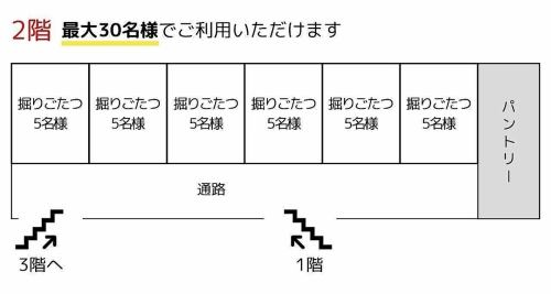 少人数~40名程度まで全席個室でご案内可能です。掘りごたつ席、お座敷とご利用のシーンやお好みに応じてご利用いただけます。2階の掘りごたつ席は、5名様からお席を結合して、最大30名様でご利用いただけます♪また、40名様以上の団体のお客様には、2階と3階をつなげて広々とした空間をご提供もすることも可能です♪