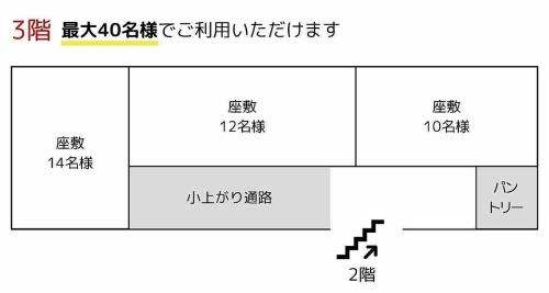広々とした3階のお座敷席は、大人数での宴会に最適なスペースです!最大40名様までご利用いただけるため、会社での各種宴会、大切な仲間との集まり、結婚式の二次会など、様々なシーンに対応可能です。ゆったりとした座席配置で、心地よい空間の中、ご宴会をお楽しみいただけます。